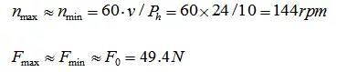 根据设计要求可知:X向工作台运动速度为v=24m/min,对应电机转速n2=144rpm,最大加速度为a=40mm/s2,则工作台速度从0升至25mm/s所需时间: