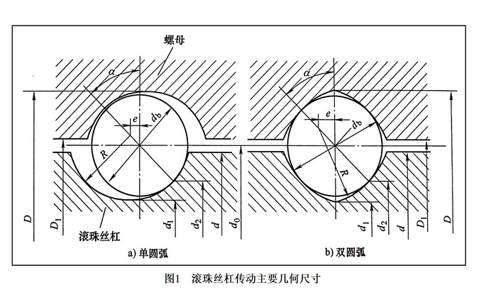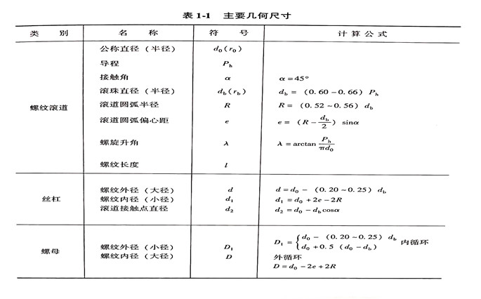 滚珠丝杠传动主要几何尺寸如图1-17所示,其尺寸计算列于表1-1。