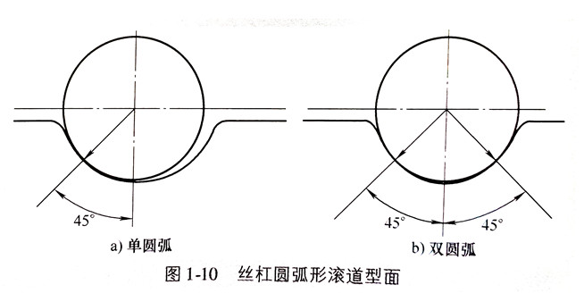 螺纹滚道型面是指通过滚珠中心作螺旋线的法截平面与丝杆、螺母螺纹滚道面的交线的形状。这个型面也称为螺纹法向截形。这个滚道型面的几何形状、尺寸以及材料的机械性质,对滚珠螺旋传动的承载能力、摩擦特性、轴向刚度和轴隙调整均有较大影响。基于上述各因素的考虑,目前国内应用得最广的滚道型面,有单圆弧形和双圆弧形两种。如图1-10所示