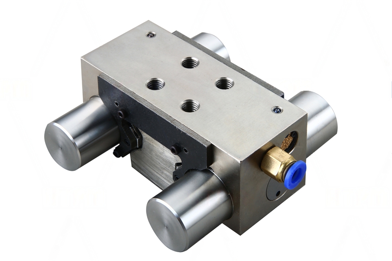 结构及特点 通过弹簧储能作用于楔形块实现钳制。 利用气压解除钳制。 安装方便,与工作台直接相连,无需更改工作台尺寸。 精密定位,适用于夹紧滚动直线导轨。